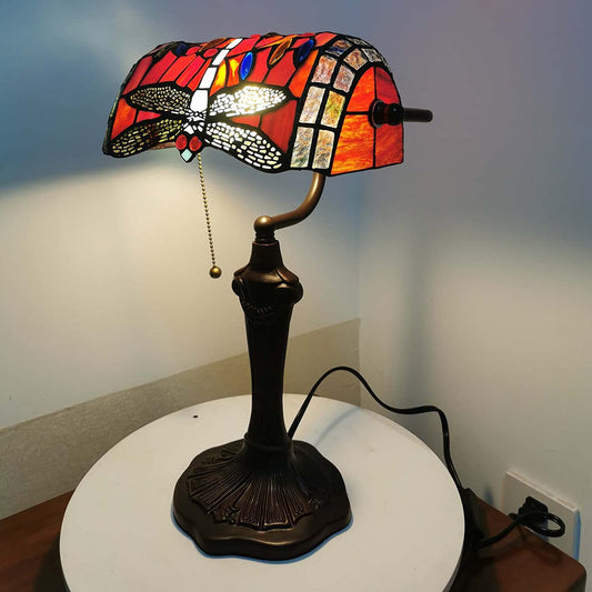 " Tiffany Dragonfly Banker Table Lamp: Exquisite Stained Glass Beauty for Timeless Elegance"
