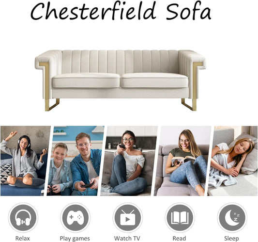 "Luxurious Velvet Chesterfield Sofa: Elegant Flair, Plush Removable Cushions, Opulent Gold Legs - Timeless Mid Century Tufted Design in Beautiful Beige"