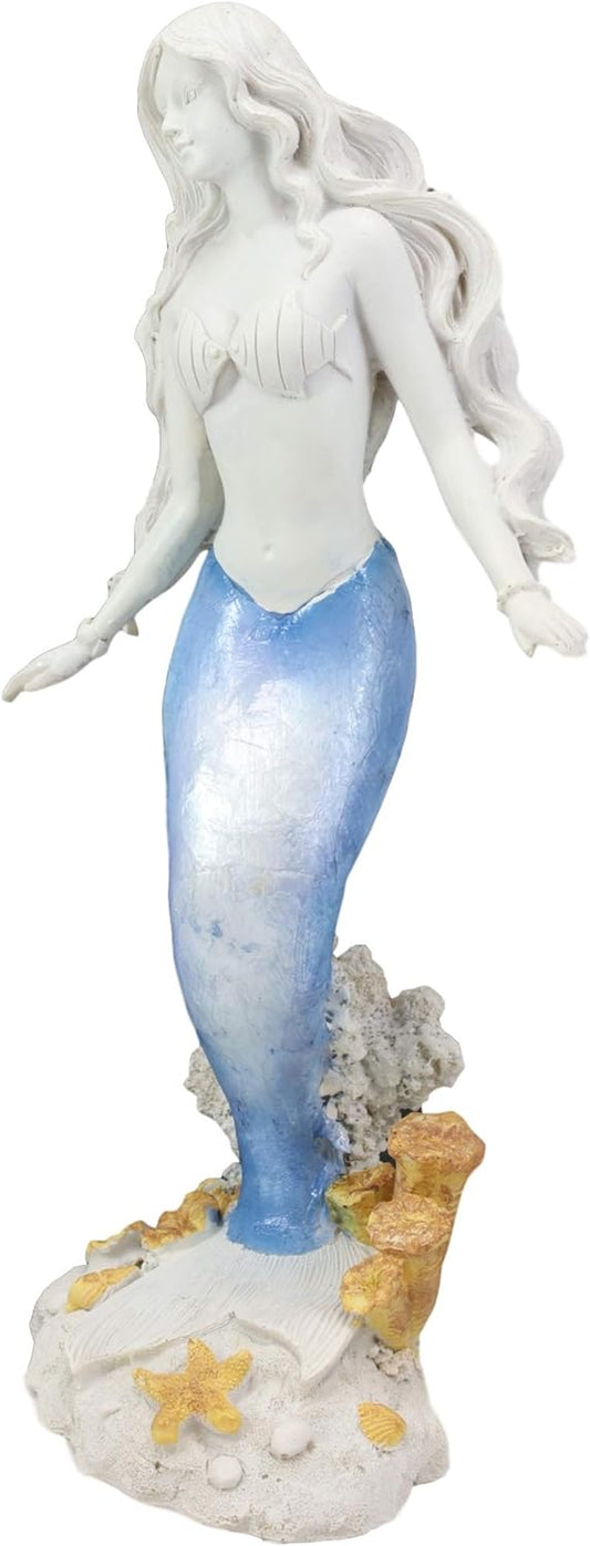 "Enchanting Oceanic Capiz Standing Mermaid Statue: Captivating Blue & White Gradient Nautical Decor"